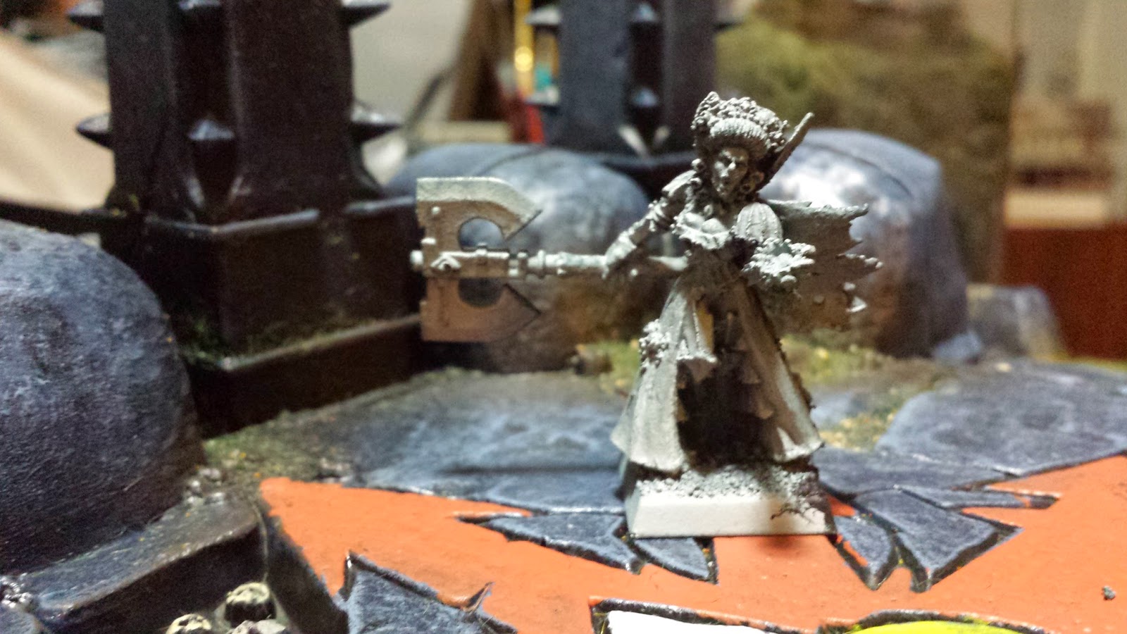 First off, we have a vampiress from Games Workshop... that I've managed to completely forget the name of... Well, she's one that I stole the hand from for Lady Avery's sculpt, so I decided to replace her dainty little hand and fine sword... with a Warhammer 40K power axe. Well, I never said that I had good taste, but I do like the image of a woman wielding a weapon near as large as she is: